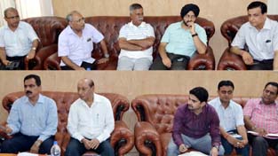 Minister for PHE, Sukhnandan Kumar Choudhary reviewing mega WSS projects in a meeting at Jammu on Monday.