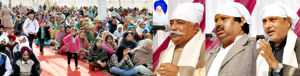 Minister for Planning, Ajay Kumar Sadhotra, Minister for Housing, Raman Bhalla and Minister for PHE, Sham Lal Sharma addressing gathering at Jammu on Monday.