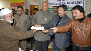 Minister for R&B Abdul Rehman Veeri giving cheque to a man at Anantnag on Saturday.