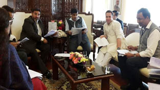 Minister for R&B Syed Mohd Altaf Bukhari alongwith MoS PWD Sunil Sharma and three MPs of PDP & BJP during a meeting with Union Minister for Road, Transport & Highways Nitin Gadkari in New Delhi on Thursday.