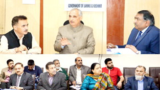 Minister for Revenue A R Veeri chairing a meeting at Jammu on Thursday.