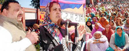 Minister for Social Welfare Sakina Itoo and Provincial President National Conference Devender Singh Rana addressing National Conference rally at Nagrota on Sunday.