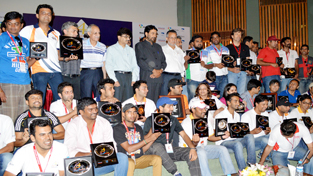 Minister for Tourism, Ghulam Ahmed Mir along with motorists and others during award ceremony of 4th Mughal Road Car Rally, organized by Himalayan Motor Sports at SKICC in Srinagar on Sunday. —Excelsior/Amin War