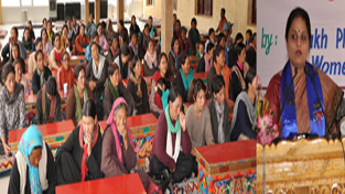 Minister of State for Education, Information and Culture, Priya Sethi delivering lecture during a seminar on women in Leh on Sunday.