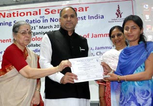 Minister of State for Health Shabir Ahmed Khan distributing certificate to paper presenter on Thursday.
