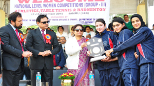 Minister of State for Information, Education and Culture, Priya Sethi presenting trophy to J&K March Past contingent on Saturday.