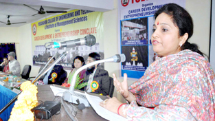 Minister of State for Education Priya Sethi speaking at a Career Development and Entrepreneurship Conclave at Jammu on Saturday.