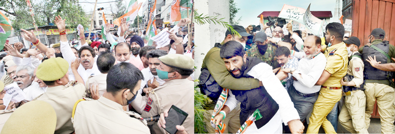 Congress leaders and workers were forcibly stopped by police at Maulana Azad Road, Srinagar but they continued to protest against the high handedness of police. JKPCC president along with dozens of leaders and workers were detained by police and lodged in Police Station.
