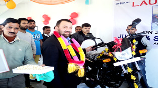 MLA Bishnah Dr Kamal Arora unveiling Bajaj Platina 100ES at M/s Jugal and Sons Automobiles, Arnia (sale, spare, service outlet of NSF Bajaj) in presence of customers, financers and mechanics. Bajaj Platina is available in three vibrant colours--Ebony Black, Electron Blue and Candy Red.
