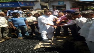 MLA Nowshera Ravinder Raina kick starting blacktopping of road at Siot on Tuesday.