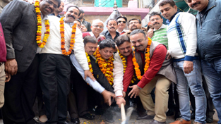 MLA Rajesh Gupta, JMC Commissioner Kiran Wattal and president CCI, Rakesh Gupta digging the ground to lay foundation of lane in Kanak Mandi on Saturday.