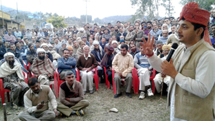 MLA Ramnagar R S Pathania addressing a public gathering at Majalta on Sunday.