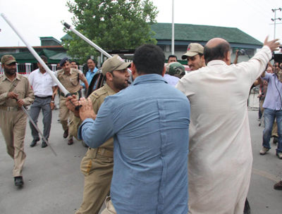 Srinagar, July 11: The independent MLA Abdul Rasheed today made an unsuccessful attempt to take hundreds of stray dogs inside the Srinagar’s Civil Secretariat.