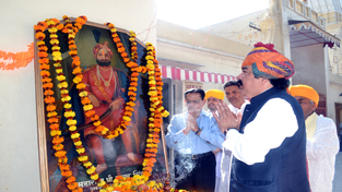 MLC Ajatshatru Singh and other members of Dharmarth Trust paying tributes to Maharaja Gulab Singh at Raghunath Mandir Jammu on Wednesday.