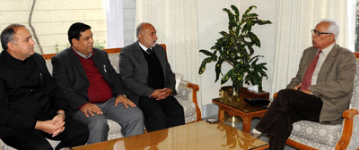 Mr. Ravinder Sharma, who was accompanied by Shabir Khan, former Minister and Ashok Sharma, former MLA, apprised the Governor about their demands relating to extension of reservation to Pahari Speaking People in the State; adequate compensation to recent flood and rains affected people of Rajouri and Poonch area; bringing left-out deserving flood affected families within the purview of free ration quota; release of long pending wages to Community Participation and other daily rated workers working in various departments.