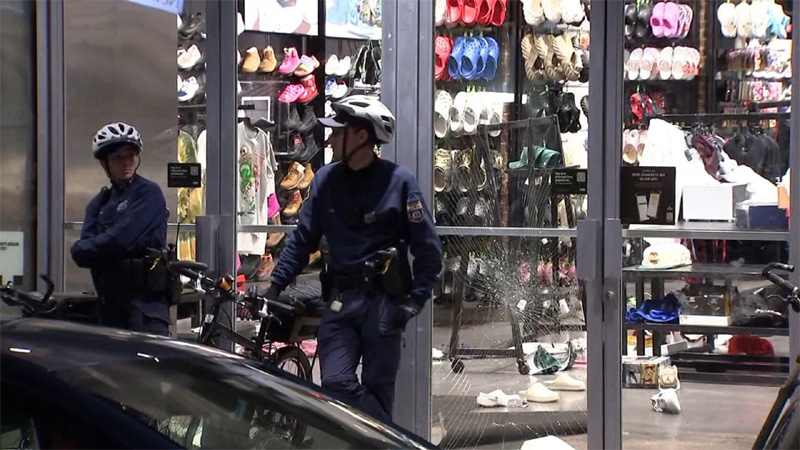 Video on social media showed masked people in hoodies running out of Lululemon with merchandise and police officers grabbing several and tackling them to the sidewalk. Photos of a sporting goods store at a mall showed mannequins and sneakers scattered on the sidewalk.
