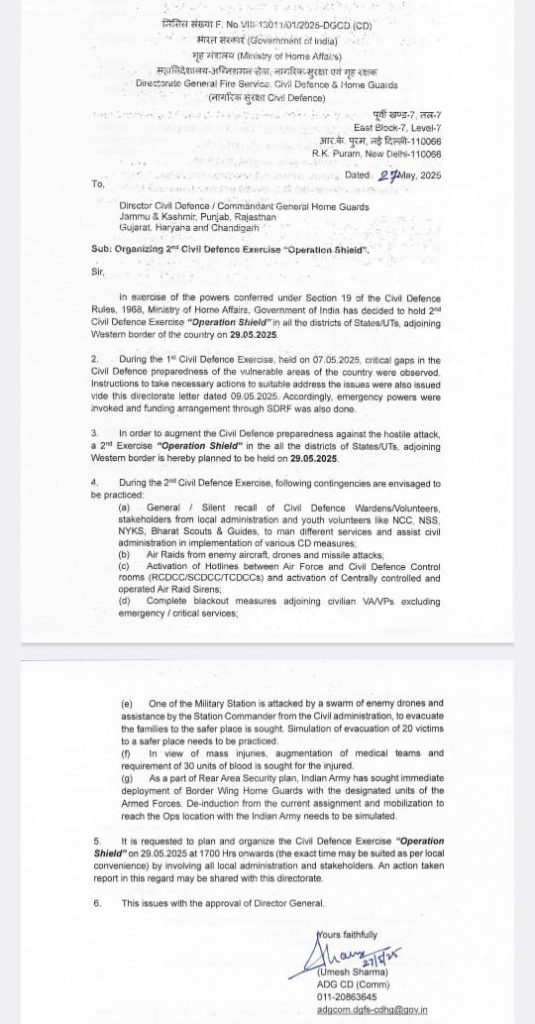 NEW DELHI, May 28: Security drills will be held in border districts of states neighbouring Pakistan on Thursday, days after India launched Operation Sindoor, which targeted terror sites in Pakistan, as per TV reports. The mock drills will be held in Gujarat, Punjab, Rajasthan and Jammu and Kashmir, the reports stated.