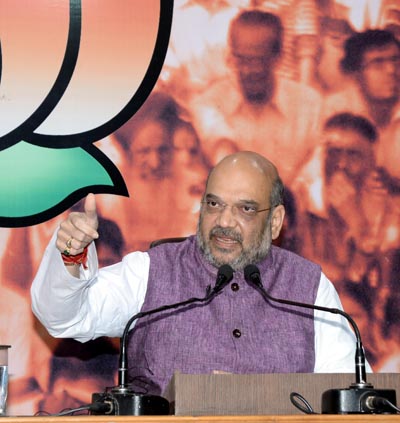 BJP President Amit Shah addressing a press conference on 2-years of Prime Minister Narendra Modi led NDA Government in New Delhi on Friday. (UNI)