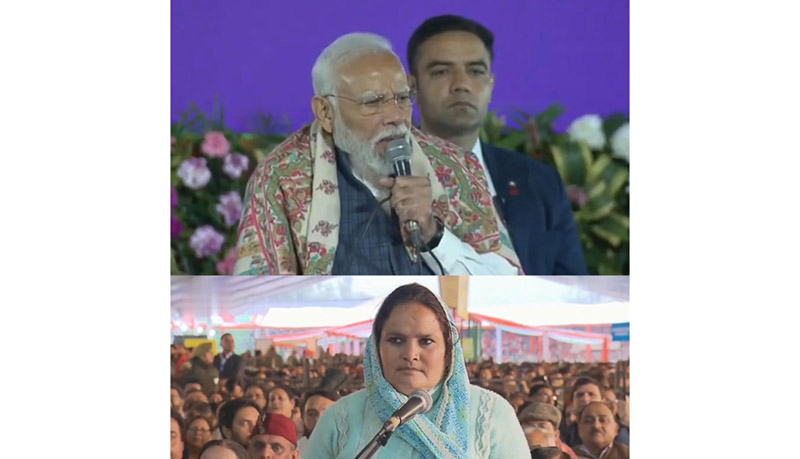 During a public rally at MA Stadium in Jammu, the PM encouraged a Self-Help Group (SHG) head Kirti Sharma of Basohli area of Kathua district to leverage the loan scheme under Grameen Aajeevika scheme and contribute to the success of rural women.