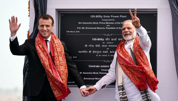 Mar 12: Prime Minister Narendra Modi and French President Emmanuel Macron today inaugurated Uttar Pradesh’s biggest solar power plant in Mirzapur district’s Chhanvey block.