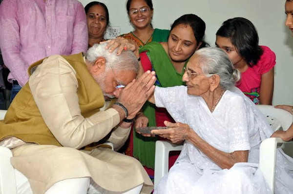 Modi, 63, bowed down before his mother Hiraba, who blessed him by putting both her hands on him, as the trends pointed to a clear win for the BJP in the Lok Sabha polls.