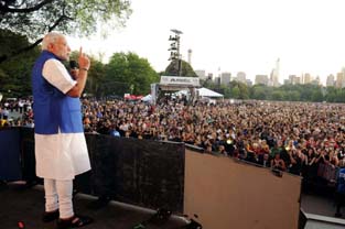 Wearing a blue Nehru jacket over a white kurta, Modi began his speech in English. “How are you doing New York? I hope you are having a good time.”