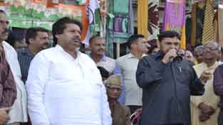 MP Madan Lal Sharma alongwith Minister for Culture, Housing and Horticulture Raman Bhalla addressing a public meeting at Jammu on Saturday.