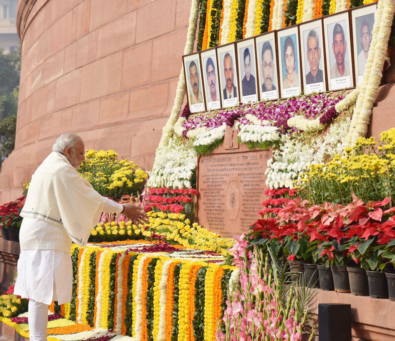 The Prime Minister, Shri Narendra Modi paying floral tributes to the martyrs of the 2001 Parliament attack, at Parliament building, in New Delhi on December 13, 2016.