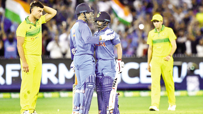 MS Dhoni (87*) and Kedar Jadhav (61*) celebrating partnership against Australia during 3rd ODI at Melbourne on Friday.
