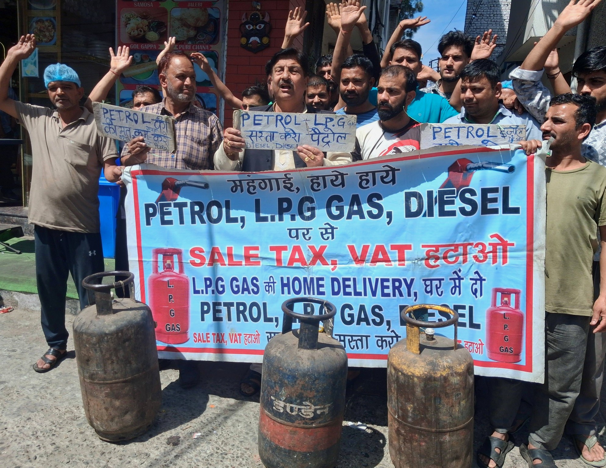 The protest was led by MSJK leader, Sunil Dimple who claimed that soaring prices of LPG has created shortages and small eateries like sweets shops, hotels, restaurant and tea stalls are facing problems.