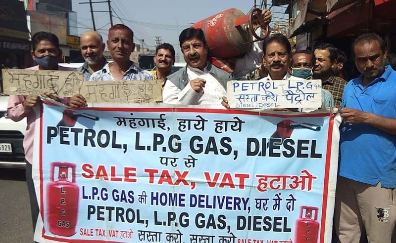 JAMMU, June 7: Mission Statehood Jammu Kashmir (MSJK) activists here today under the leadership of their president, Sunil Dimple staged a protest demonstration against the rising prices of petrol, diesel, cooking gas, Toll Tax etc.