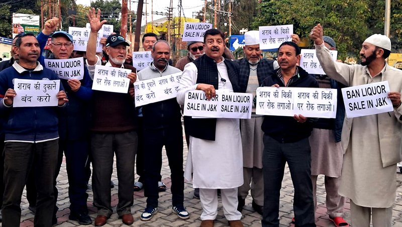 JAMMU, Feb 22: Activists of Mission Statehood Jammu Kashmir (MSJK) here today staged a protest demonstration under the leadership of their president, Sunil Dimple demanding a ban on liquor sale in J&K and Ladakh.