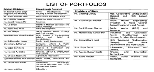According to the list of portfolios released by Chief Secretary Mohammad Iqbal Khandey late this evening, only two out of eight Ministers of State have been given Independent Charge. Both of them belonged to BJP including Chering Dorjey, MLC from Leh, who has been given Independent Charge of Cooperatives but would be Minister of State for Ladakh Affairs.