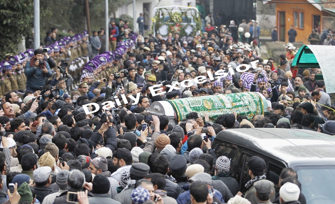 The ‘Namaaz-e-Janazah’ (funeral prayers) of the departed leader was offered in the Sher-e-Kashmir Cricket Stadium at Sonawar here, in which thousands of the mourners took part.