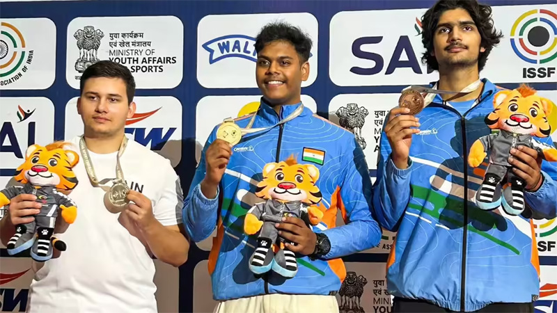 Individual Neutral Athlete (AIN) Aleksandr Kovalev, who had won the 25m rapid-fire pistol gold earlier in the competition, took the silver with 577 points while Sahil Choudhary ensured a bronze for India with a score of 573.