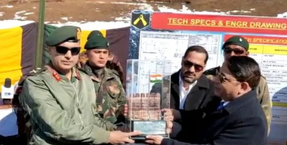 Signing the MoU in Gulmarg, GoC Dagger Division, Virender Vats and representing officer from solar industry India, Ramit Arora unfurled the replica of Kashmir’s heights flag to be installed in Gulmarg and showcased an Indian made multi-mode hand grenade set to replace the old one.