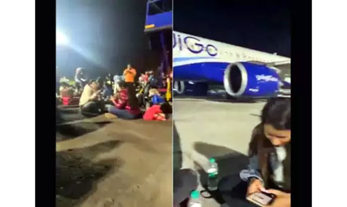 Many passengers rushed out of an IndiGo aircraft at the Mumbai airport, sat on the tarmac, and some were also seen having food there as soon as their diverted Goa-Delhi flight landed after a long delay on Sunday.