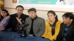 Noted singers, Deepak Kumar and Sonali Dogra alongwith office bearers of Nirvana Academy addressing a press conference at Jammu on Thursday.