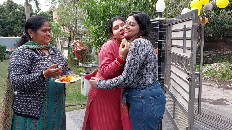 Muskan Mahajan after returning from war hit Ukriane being warmly received by her family members at her residence in Kathua on Friday.-Excelsior/ Pardeep