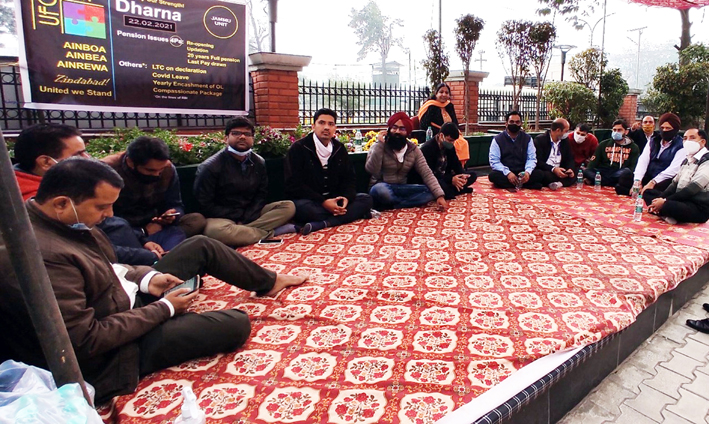 JAMMU, Feb 22: The executive members of the associations of officers, employees and retirees of Jammu unit of NABARD under the banner of United Forum of Officers, Employees and Retirees of NABARD (UFOERN) held a day-long dharna today.