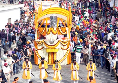 The Nagar Kirtan started from Gurudwara Yadgar Shri Guru Nanak Devji, Chand Nagar. It was led by Panj Piyaras in traditional religious dress which was followed by Swari of Guru Granth Sahib on a fully decorated open vehicle followed by scores of Jhankis, which were organized by various Sikh Organisations. A large number of people from Hindu community also paid their obeisance to Guru Granth Sahib enroute. The students from different schools also participated in the programme and displayed band skills.