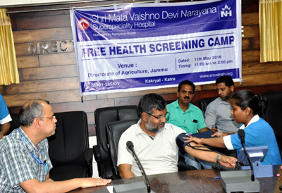 JAMMU, May 11: A one-day Health Screening Camp was conducted today by Shri Mata Vaishno Devi Narayana Superspeciality Hospital (SMVDNSH), Kakryal (Katra) for the officers and staff of Directorate of Agriculture, at Krishi Bhawan, Talab Tillo, Jammu.