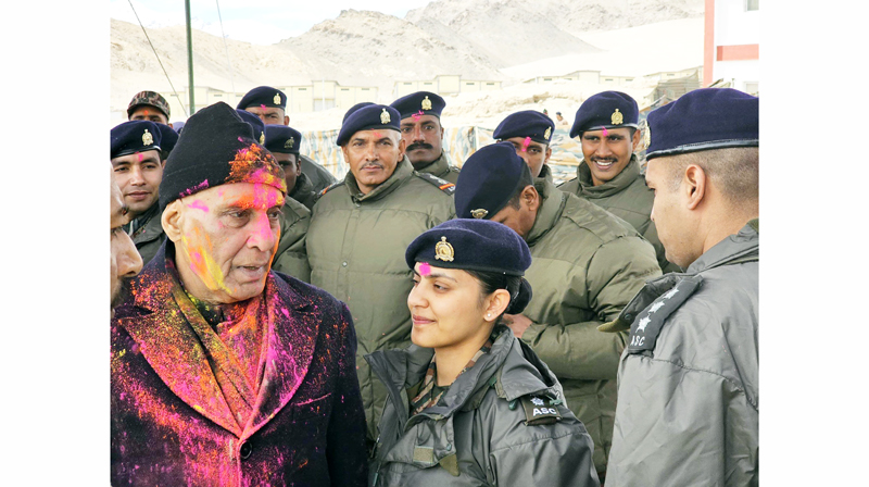 Addressing the soldiers in Leh after celebrating Holi with them, Rajnath said : “We are progressing and leading a happy life as our vigilant soldiers stand ready at the borders. Entire country feels safe because the brave soldiers are protecting the borders’’.