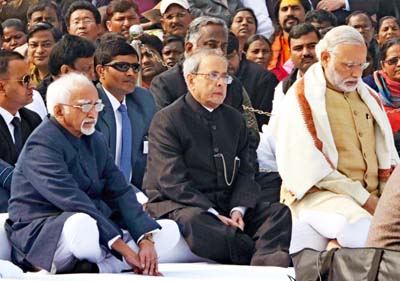 Mukherjee, Vice President Hamid Ansari and Modi paid floral tributes at Gandhi’s memorial at Rajghat here.