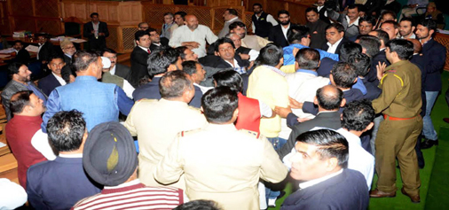 National Conference and Congress members providing cover to Independent MLA Engineer Abdul Rashid, as BJP members assaulted him on the issue of a ‘Beef party’ at MLA Hostel in Srinagar on Thursday. (UNI)