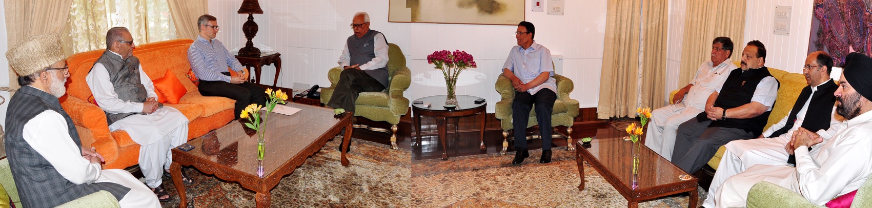 SRINAGAR, JUNE 9: A delegation of National Conference (NC) led by Sh. Omar Abdullah, former Chief Minister, met Governor N.N. Vohra at the Raj Bhavan here today. The delegation comprised Sh. Ali Mohammad Sagar, MLA; Sh. Mohd. Shafi Uri, MLA; Sh. Mohd. Akbar Lone, MLA; Sh. Devender Singh Rana, MLA; Sh. Nasir Sogami, Provincial President, NC; Sh. Choudhary Ramzan, former MLA; and Sh. Shami Oberoi.