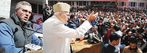 National Conference president Dr. Farooq Abdullah and working president Omar Abdullah addressing the gathering in Srinagar on Wednesday. — Excelsior Photo