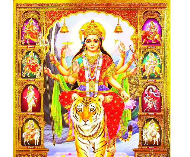 The nine number is considered complete, perfect, and divine number, represents culmination of wisdom and experience. The number of Mala beads for Jaap are 108, the total of which is also 9. Nine forms of Adi Shakti are worshipped during Navratri. Each has been assigned one day of Navratri. Theirnames are: 1)Shailaputri – Daughter of Mountain.2) Brahmacharini – Mother of devotion and penance 3) Chanderaghanta- Destroyer of demons. 4) Kushamanda- Goddess of cosmic egg. 5) Skanda Mata- Goddess of motherhood and children 6) Katyayani- Goddess of power 7) Kalaratri- Goddess of auspiciousness and courage.8) Mahagauri- Goddess of beauty and women 9) Siddhidhatri- Goddess of supernatural powers.