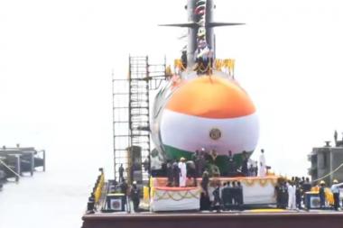 Defence production secretary Ajay Kumar’s wife Veena Ajay Kumar launched the submarine at Mazagon Dockyard in Mumbai.