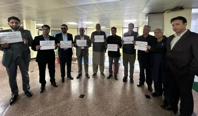 The protest took place ahead of the commencement of the Assembly proceedings as legislators sought to draw attention to what they described as an assault on democratic values. The MLAs held placards reading “Respect the Vote, Respect the Voice, Free Mehraj Malik.”